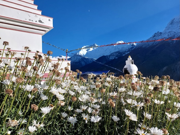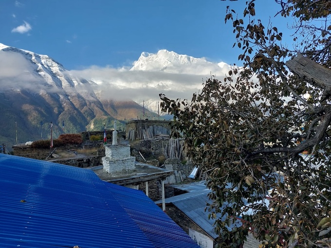 Es geht langsam weiter hinauf. Zunächst durch einen wunderschönen Nadelwald bis wir die Baumgrenze erreichen. Die Vegetation wird karger, die Weite größer und die umliegenden Himalaya Gipfel rücken immer näher ins Blickfeld. Unterwegs legen wir einen Halt in Braga ein. Einem ursprünglichen Dorf mit besonderen Charme, denn hoch oben thront eins der ältesten buddhistischen Klöster der Region, was bis heute eine wichtige Rolle spielt. Am Ende des Tages erreichen wir schließlich Manang auf 3540m. Ein wichtiger Ort im Annapurna Gebiet und idealer Platz sich noch besser an die Höhe zu gewöhnen.