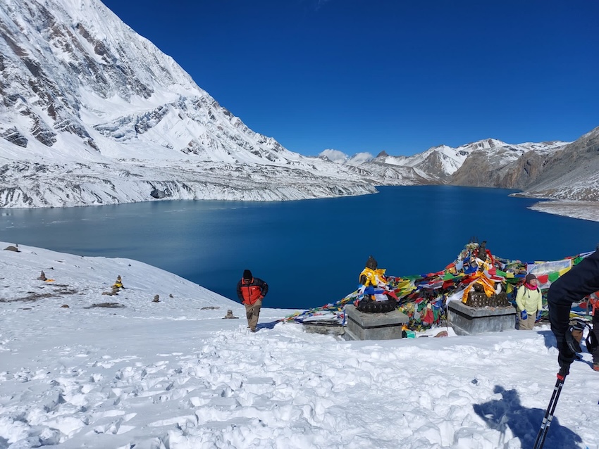 Der Tag beginnt früh, denn noch vor Sonnenaufgang machen wir uns auf den Weg zu einem der Höhepunkte des Tilicho Lake Trek. Vom Base Camp führt ein schmaler Weg immer bergauf über felsiges und teils schneebedeckten Geländes mitten hinein in die beeindruckende Hochgebirgslandschaft. Mit jedem Meter wird die Umgebung stiller und weiter bis zu dem Moment wenn der türkisblau schimmernde Tilicho Lake auf 4925m vor Ihnen liegt. Eingebettet zwischen schneebedeckten Gipfeln, wie den Khangsar Kang 7485m, den Tarke Kang 7193m und dem Gangapurna 7455m und Gletschern liegt einer der höchstgelegenen Bergseen der Welt zu Ihren Füssen. Hier bleibt Zeit die Natur in all ihrer Schönheit aufzusaugen und in Ruhe das Panorama im Foto festzuhalten. Anschliessend laufen wir den gleichen Weg zurück wieder zum Tilicho Base Camp.